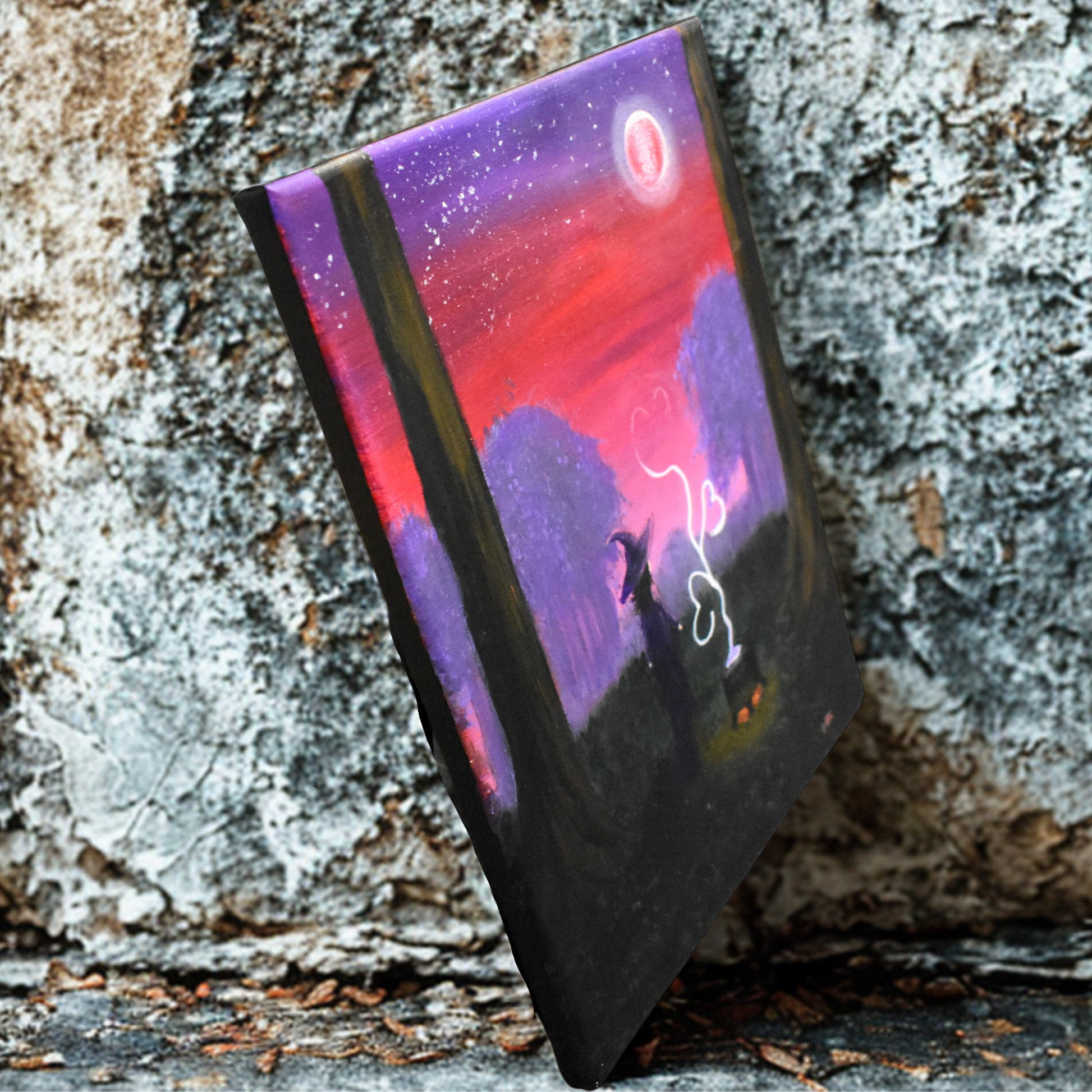 The Atmosphere: Magical, vibrant, and full of heart. The striking silhouette of the witch and the towering trees contrasts beautifully with the soft, glowing colors of the sunset. It’s a perfect piece for anyone who finds magic in the evening sky.